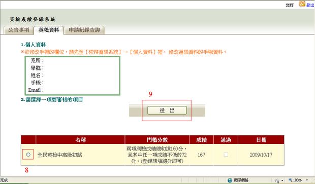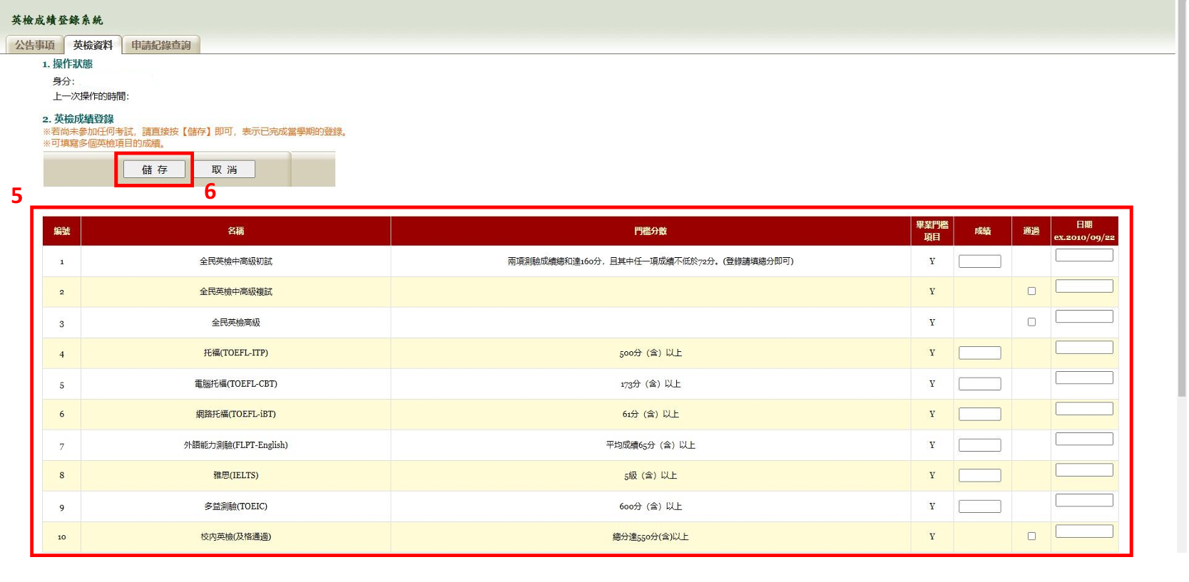 5.依個人校外考試情況填寫“成績”及“日期”,可填寫多個英檢項目。若尚未參加任何考試,直接跳6。 |