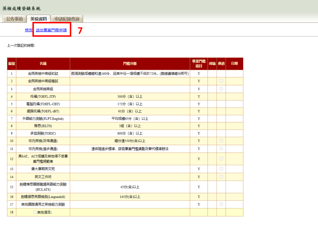 | 畢業門檻登錄學生,請依上述步驟填寫成績後,7.點選“送出畢業門檻申請”。 | |